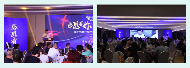 非常榮幸能夠邀請到大家來參加振宇物流成立16周年慶典,今天又恰逢是我小女兒張宸語的百天宴。在這個特殊的日子里,榜樣精英高朋滿座,新朋老友齊聚一堂。在此,我懷著感恩的心,向振宇的全體員工、向關心支持我們的社會各界新老朋友致以最誠摯的謝意,和熱烈的歡迎!