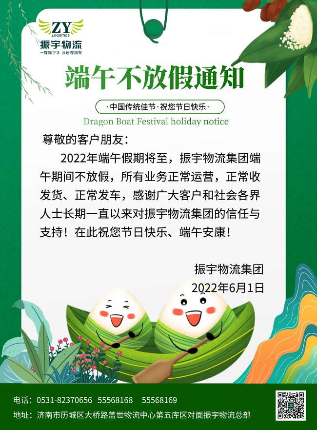 2022年端午假期將至,振宇物流集團端午期間不放假,所有業務正常運營,正常收發貨、正常發車,感謝廣大客戶和社會各界人士長期一直以來對振宇物流集團的信任與支持!在此祝您節日快樂、端午安康!