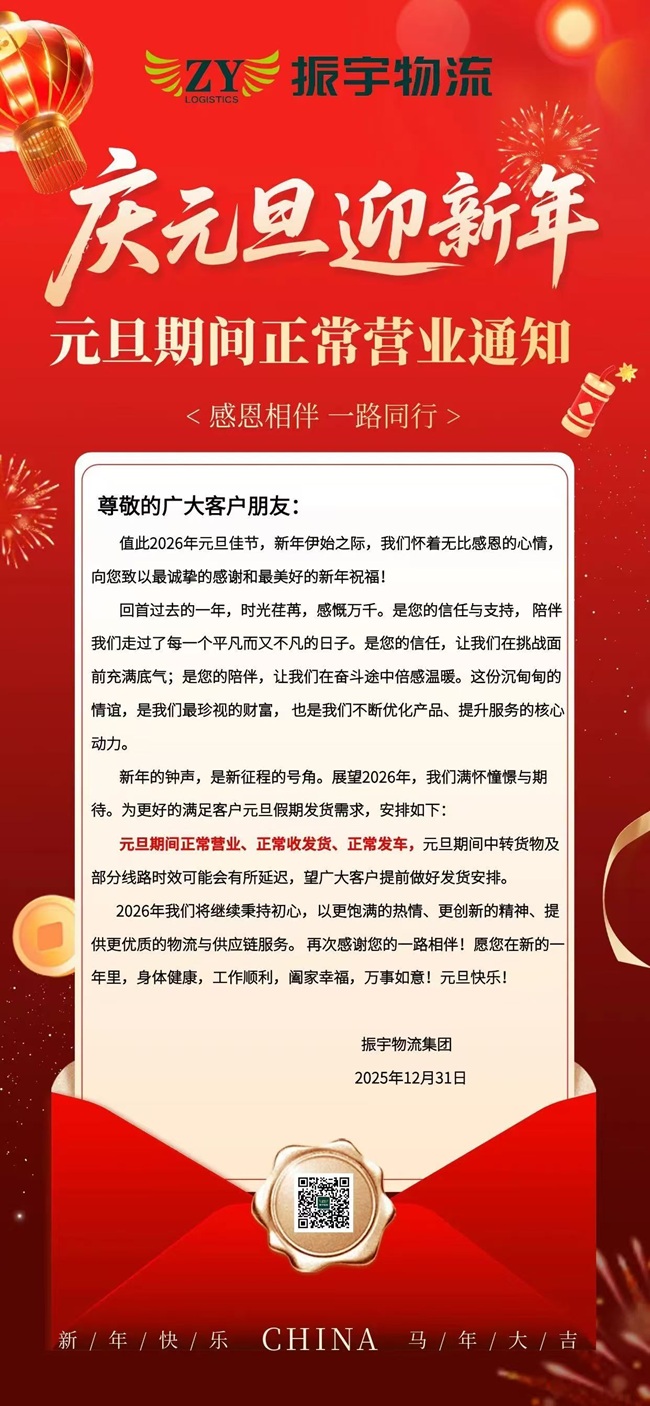 2026年我們將繼續秉持初心,以更飽滿的熱情、更創新的精神、提供更優質的物流與供應鏈服務。再次感謝您的一路相伴!愿您在新的一年里,身體健康,工作順利,闔家幸福,萬事如意!元旦快樂!