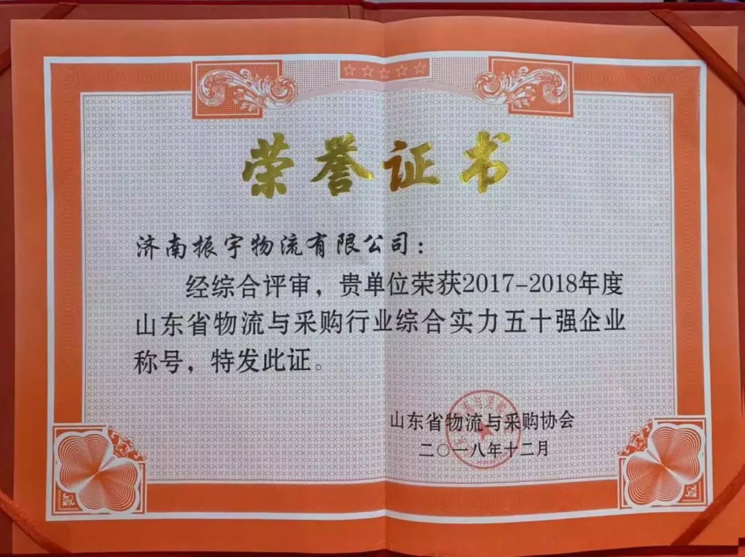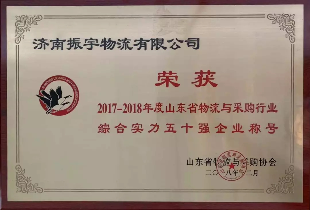 振宇物流經(jīng)山東省物流與采購協(xié)會(huì)綜合評(píng)審,榮獲2017-2018年度山東省物流與采購行業(yè)綜合實(shí)力五十強(qiáng)企業(yè)稱號(hào)。
